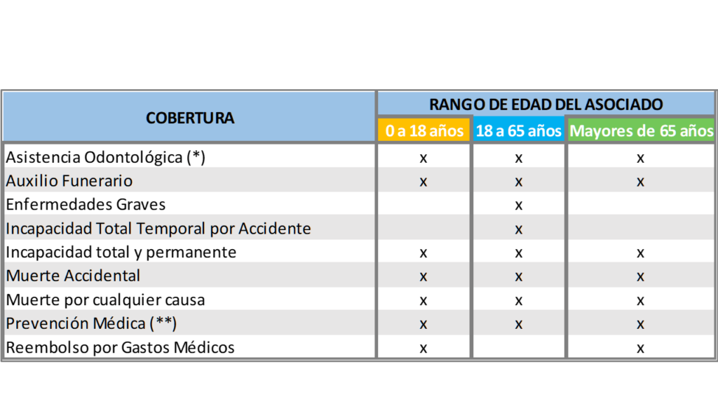 Por ser asociado a MiMu Familias Solidarias cuentas con el servicio mutual creado con el apoyo de nuestros aliados estratégicos Gallagher S.A. y COLMENA Seguros, pensando en las necesidades de nuestro grupo familiar. Como asociado, cuentas con una póliza integral de vida y accidentes creada para los grupos etarios de 0 a 18 años, de 18 años a 65 y para mayores de 65 con coberturas acorde a las necesidades de cada grupo.